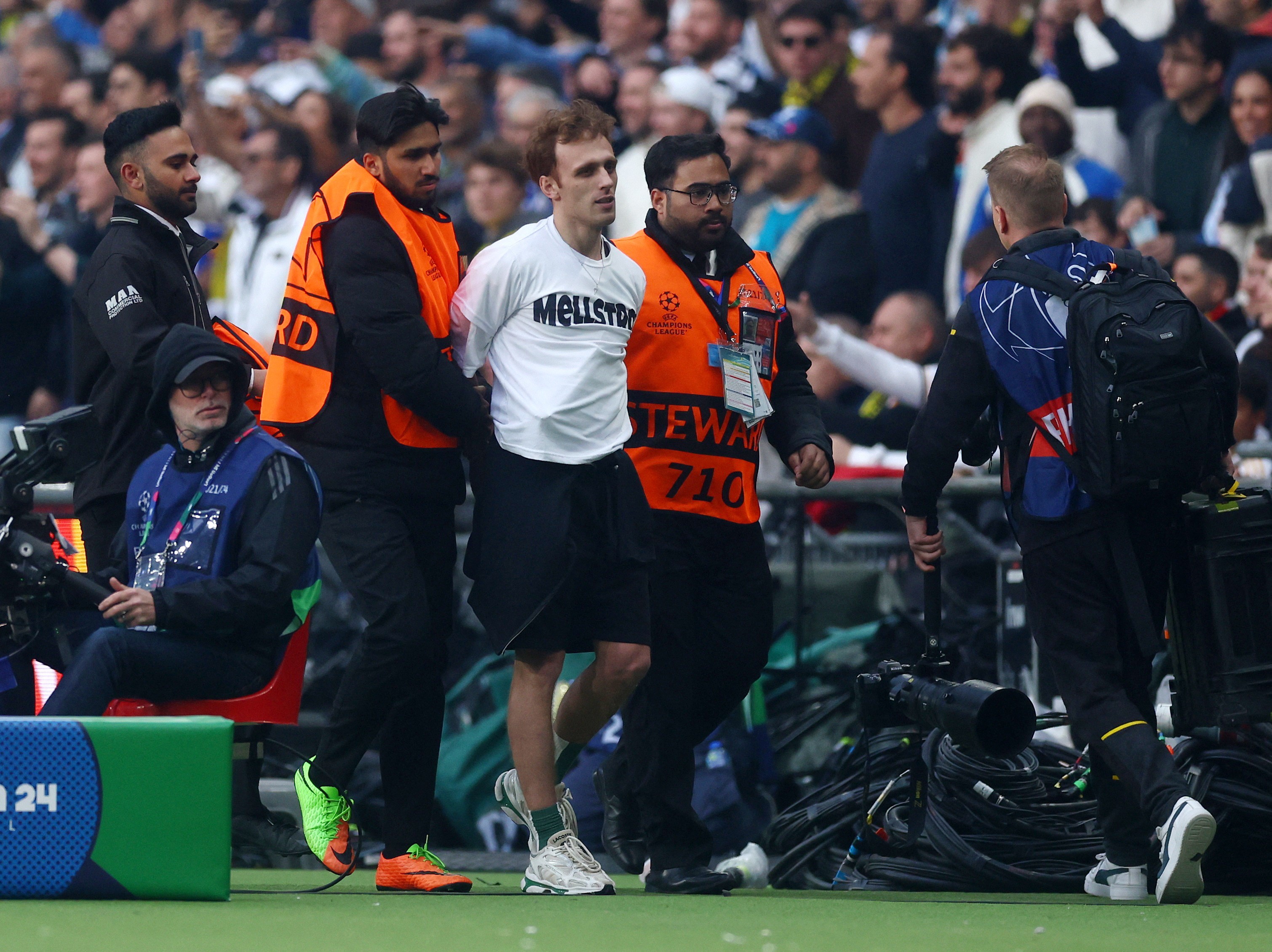 皇家马德里在温布利球场2-0战胜多特蒙德,夺得第15座欧冠冠军奖杯。但比赛刚开始一分钟,由于三人冲击球场,比赛就被迫暂停。现场安保人员花了几分钟才追上他们,然后将他们按倒在地。