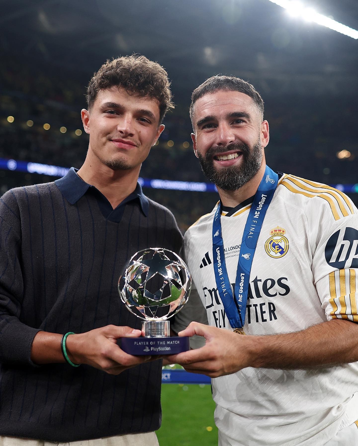 赛后,英国F1赛车手兰多-诺里斯作为颁奖嘉宾,为荣获本场比赛最佳球员的卡瓦哈尔进行颁奖和合影,两人共同手捧卡瓦哈尔的全场最佳的奖杯。
