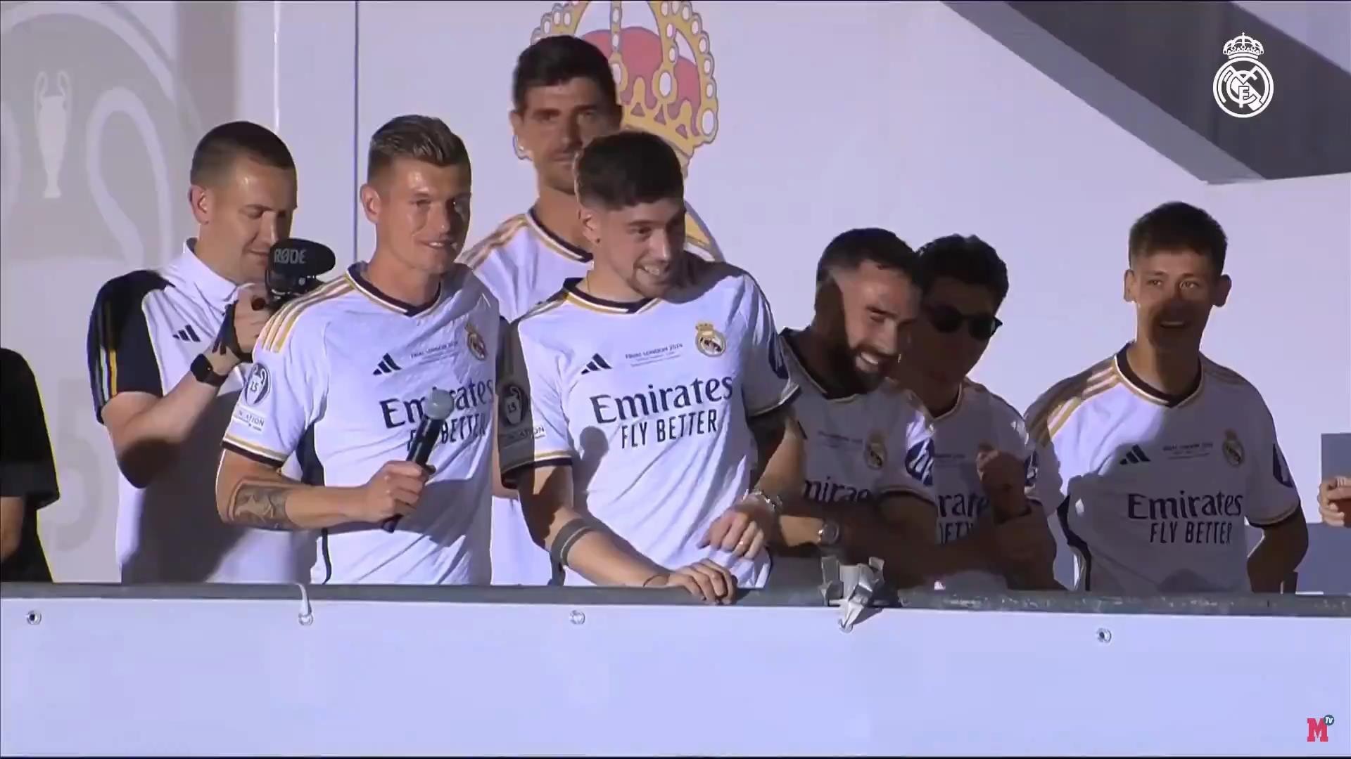 当皇马全队到达西贝莱斯广场正中央时,参与庆祝的球迷们一同呼喊着:“托尼,留下来,托尼,留下来。”显然他们仍然不愿接受托尼-克罗斯即将退役的现实。