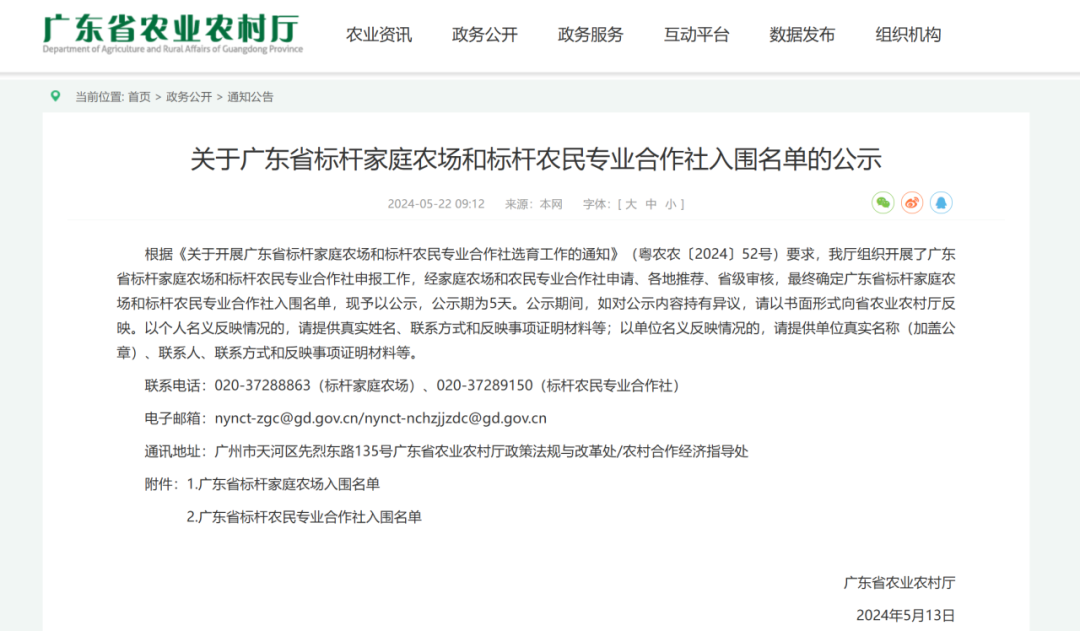 广东省农业农村厅将各地推荐的主体纳入标杆家庭农场和标杆合作社培育名单并在媒体上公示。对公示入围的家庭农场和合作社采取项目支持和政策赋能的方式,按照标杆家庭农场和标杆合作社的标准,分三年进行支持培育。