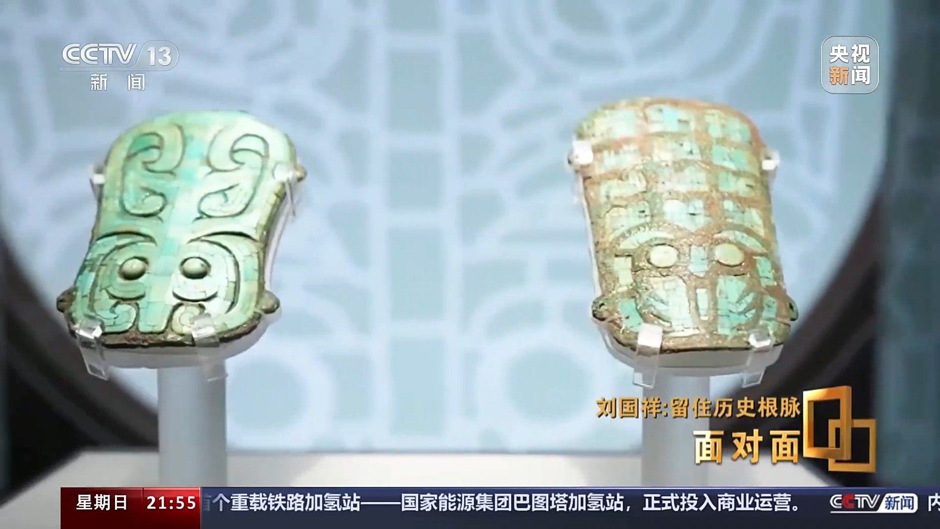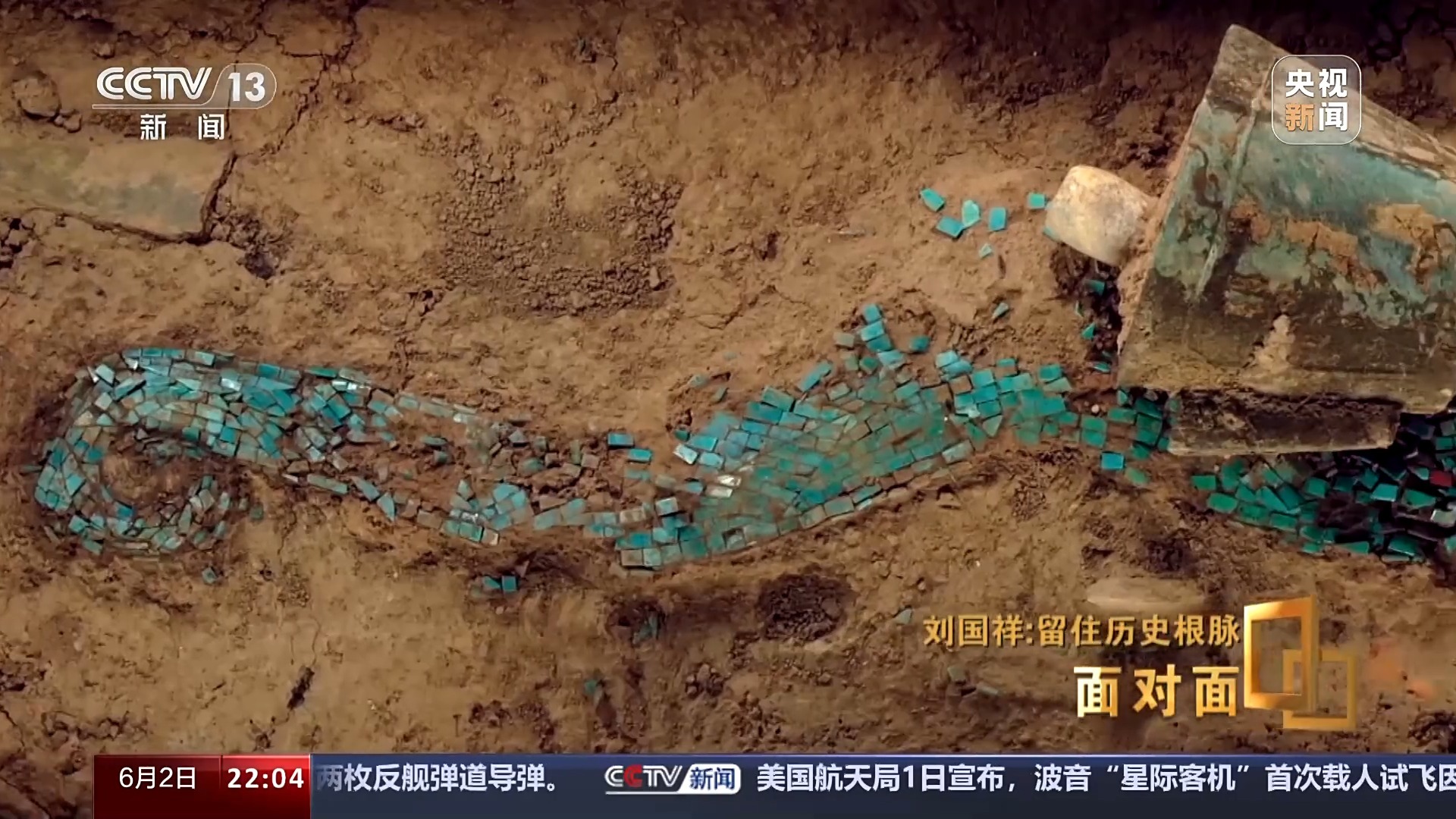 刘国祥:这是在一座墓葬里边发现的,它的长度是64.5厘米。是用2000多片绿松石镶嵌出来的,我们把它进行了整取,套箱整取,回来做实验室清理,能够完整地把它呈现出来,基本是原样的。