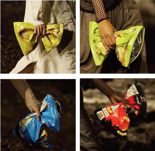 比如,在巴黎世家2023春夏大秀上曝光的“乐事薯片”包包,用皮革复刻了乐事薯片包装袋,按照四种“口味”划分为四个款式。