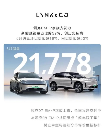 领克品牌也取得了不俗的成绩,5月销量达到21778辆,环比增长超过16%,同比增长超过50%。其中,新能源车型的销量占比高达57%,创下历史新高。