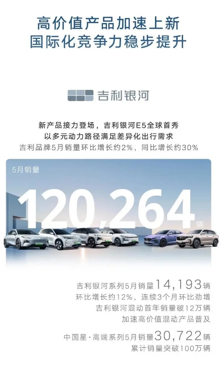 具体到品牌,吉利品牌5月销售了120264辆,环比增长约2%,同比增长约30%。吉利银河系列在5月售出14193辆,环比增长约12%,并连续三个月实现环比增长。其中,吉利银河混动首年销量已突破12万辆,而中国星·高端系列在5月的销量为30722辆,累计销量已超过100万辆。