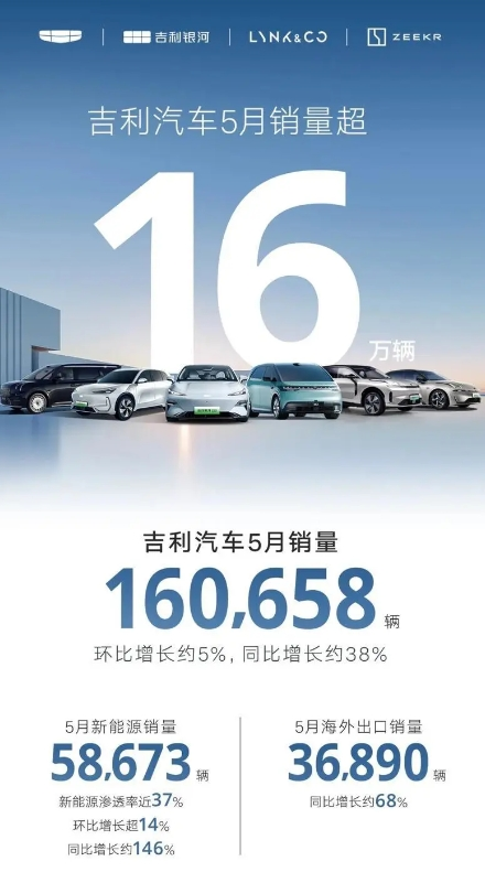 此外,根据吉利最新公布的5月份销量数据,整体销售表现强劲,共售出160658辆,环比增长约5%,同比增长高达38%。新能源车型在5月的销售中表现出色,销量达到58673辆,新能源渗透率接近37%,环比增长超过14%,同比增长更是高达146%。