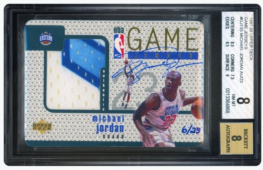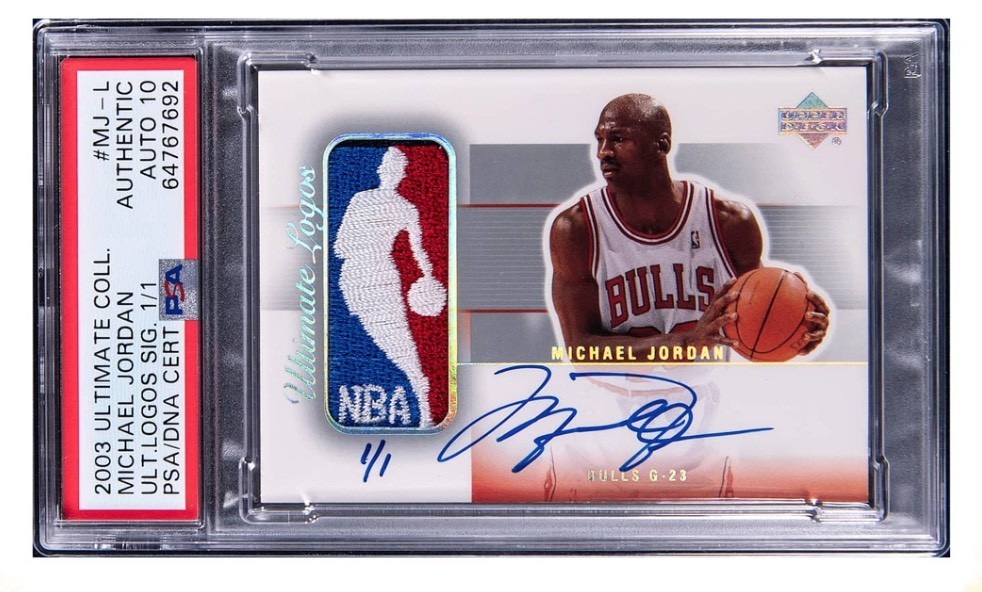 该球星卡属于2003赛季Upper Deck Ultimate Collection Ultimate Logos Signature 系列,上面有这位 NBA传奇球星身穿芝加哥公牛队球衣的形象,也是现存的唯一一张此类卡片。