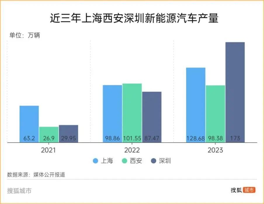 2023年,深圳以累计约173万辆的新能源汽车产量,位列全国第一,以压倒性的优势远超上海(128万辆)和西安(98万辆),成为当之无愧的“新能源汽车第一城”。