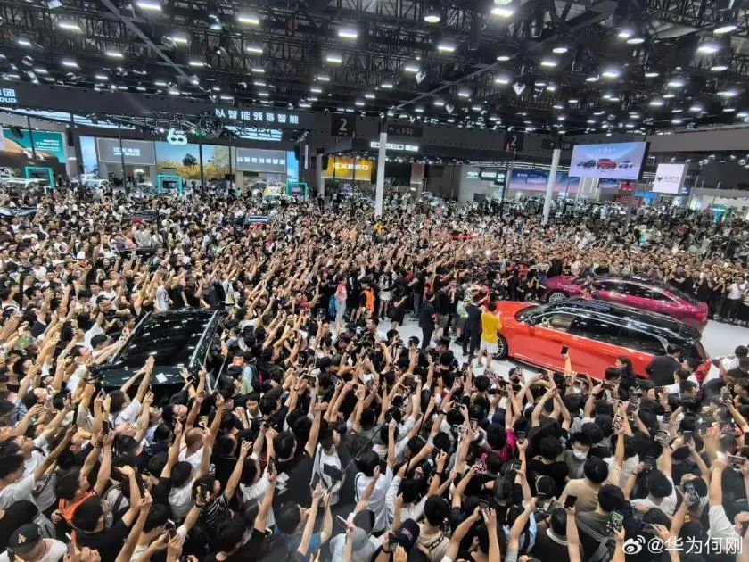 另一边,位于2号馆的华为鸿蒙智行展台也成为整个车展的焦点,现场被里三层外三层围住,粉丝高喊“遥遥领先”成为令人印象深刻的一幕。