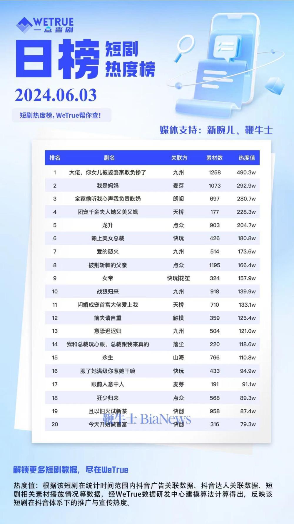 编者按:为帮助短剧从业者提供更多信息,专注于短剧报道的新腕儿和科技媒体鞭牛士联合WETRUE短剧热度榜共同推出短剧热度榜。