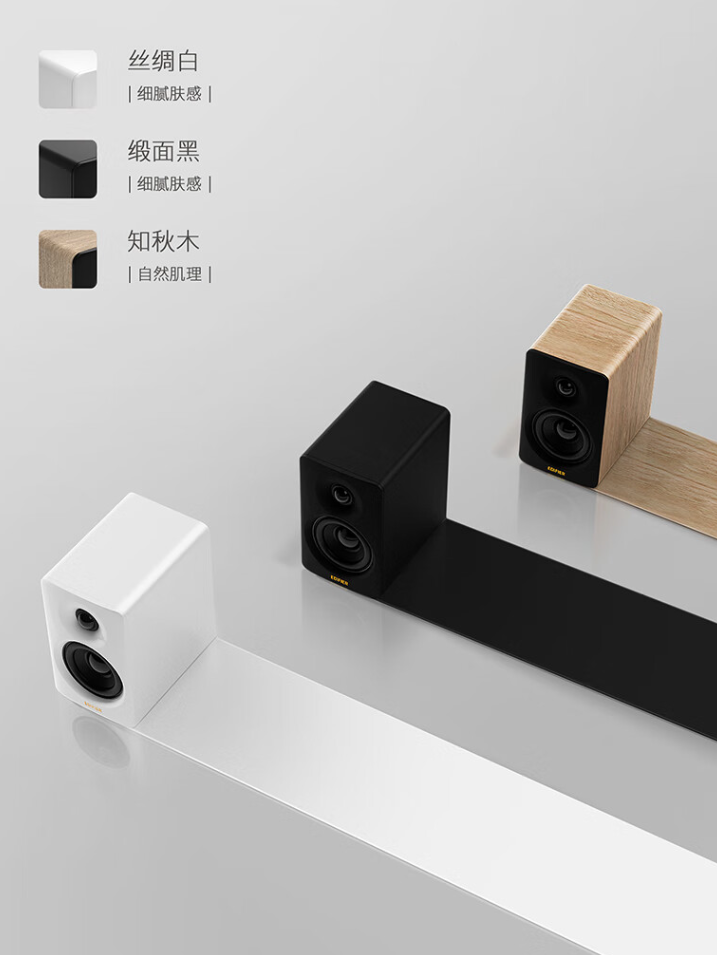 外观方面,漫步者 N300 提供了三种配色可选,分别是丝绸白、缎面黑和知秋木,可以提供不一样的风格。同时,它的机身控制相当出色,宽度仅为 10cm,不过如果打算桌面使用的朋友,还需要注意桌面的宽度,毕竟它的尺寸实际为 100×168×147 mm,对桌面的纵深要求还是比较高的。