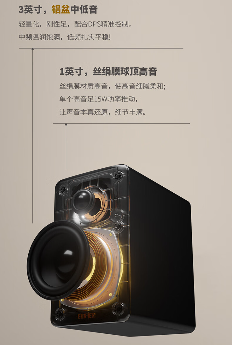 配置方面,漫步者 N300 的单个音箱之中提供了一个 3 英寸的铝盆中低音单元(18W),以及一个 1 英寸的丝绢膜球顶高音单元(15W),两只音箱组合成了共计 66W 的功率,声音表现还是比较澎湃的。