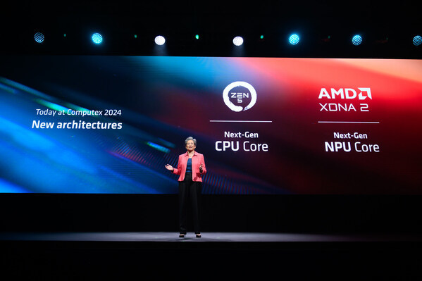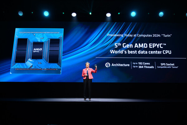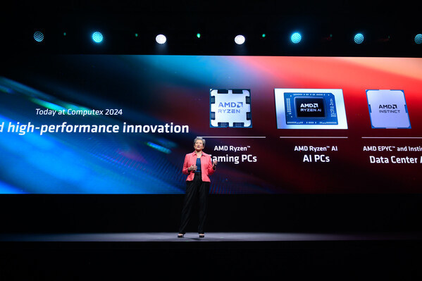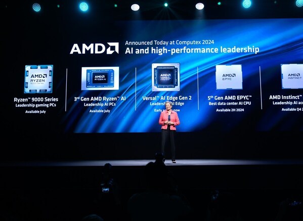 北京 2024年6月4日 /美通社/ -- 在Computex 2024 开幕主题演讲上,AMD (纳斯达克股票代码: AMD) 详细介绍了全新的 CPU、NPU 和 GPU 领先架构,为从数据中心到个人电脑的端到端 AI 基础架构带来强大算力。AMD预览了将于 2024 年下半年发布的、具有领先性能和效率的第五代 AMD EPYC 服务器处理器。AMD 宣布分别推出第三代支持AI的AMD移动处理器 AMD 锐龙AI 300 系列和用于笔记本和台式机个人电脑的 AMD 锐龙 9000 系列处理器。