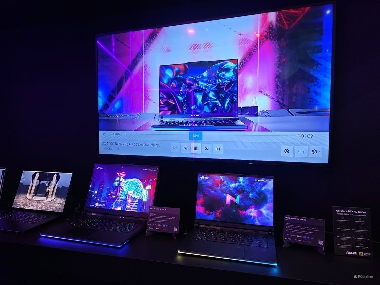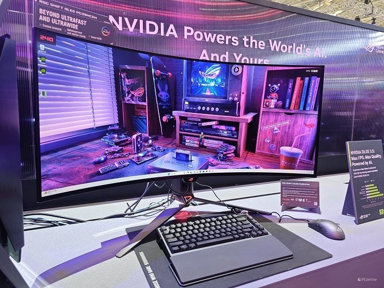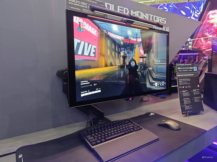 继续云逛展台,旁边就来到了显示器区域。首先引入眼帘的是世界首款双模ROG游戏显示器PG32UCDP,这款显示器其实在CES上就已经展出了,最大亮点在于它支持FHD 480Hz与4K 240Hz两种显示模式。