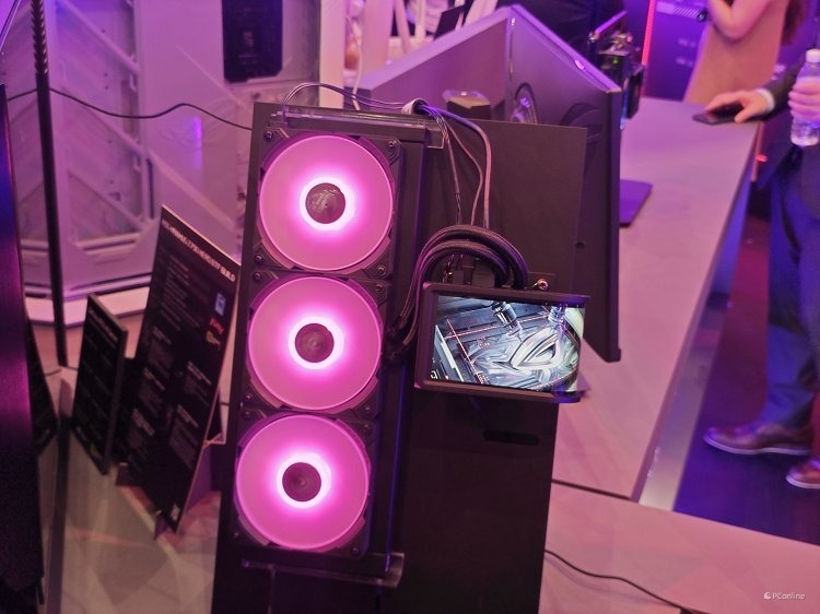 现场还展出了ROG新款水冷散热器,其命名为ROG MINIMAL TUBING AIO COOLER,据介绍,这款散热器能够兼容最新的BTF背插模式,另外水冷上6.67英寸的OLED曲面屏显就是它最大的亮点,显示效果相当惊艳,如果装机的话,甚至能够做到裸眼3D的效果。