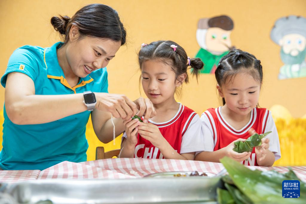 6月3日,河南省商丘市睢县古襄路幼儿园小朋友在老师的指导下学习包粽子。