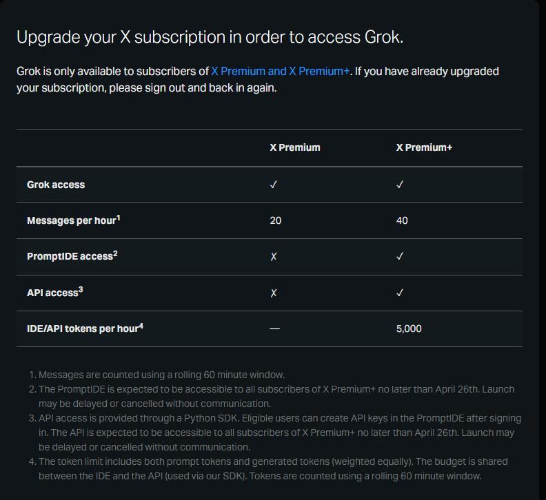 如果点击访问后提示需要申请,那么按照指示提交申请即可。不过小编提交后,收到了以下提示。目前,Grok仅对 X Premium 和 X Premium+ 的订阅用户开放。