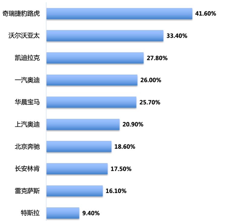 与奇瑞合资的捷豹路虎折扣最大,看来以后“七折豹”要改名“六折虎”了。第二名是沃尔沃,七折沃尔沃正在大行其道,S90、XC60等车的终端价力度确实很大。凯迪拉克第三,也不算意外,相比捷豹路虎折扣还低一些,不过“七折凯”也是常态了。