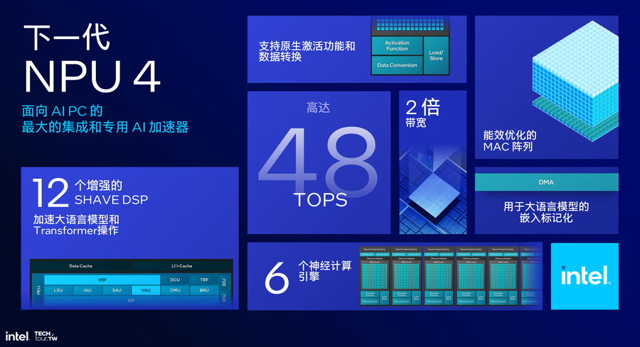 此次,英特尔还为Lunar Lake架构处理器设计了全新的NPU 4.0,利用高密度向量和矩阵数学,能够实现AI辅助运算能力。