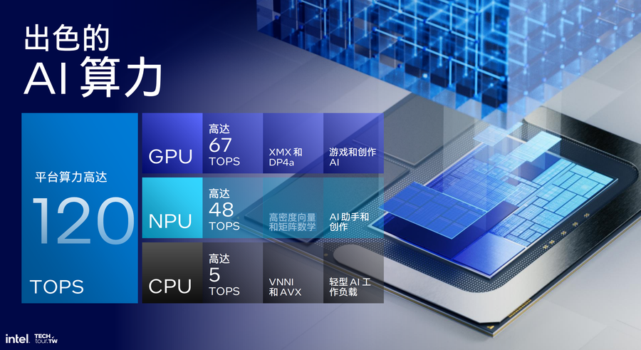 在AI PC时代,英特尔采取的是CPU+GPU+NPU共同助力更强AI性能的解决方案。全新的Lunar Lake架构处理器就是这样设计的。