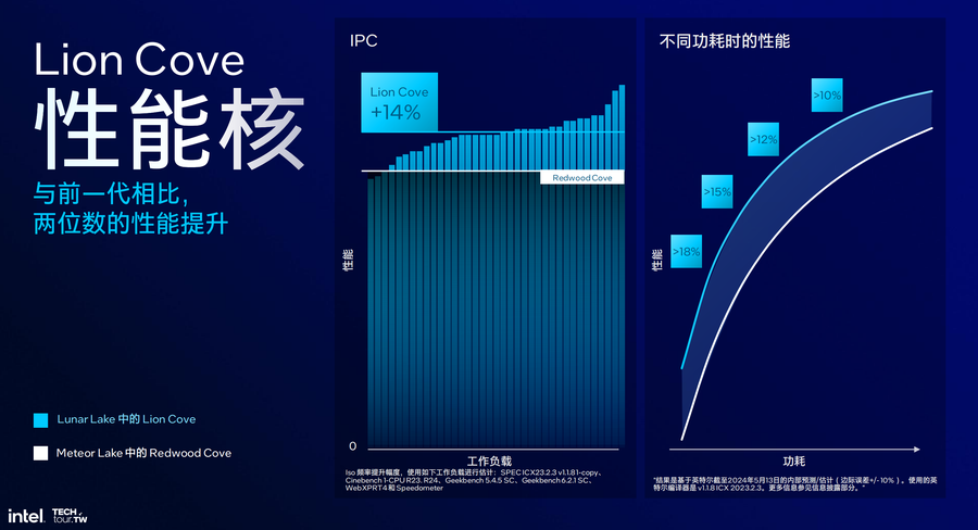 先看性能核的表现。英特尔官方数据显示,Lunar Lake的性能核相比Meteor Lake的性能核,IPC性能平均提升约14%。