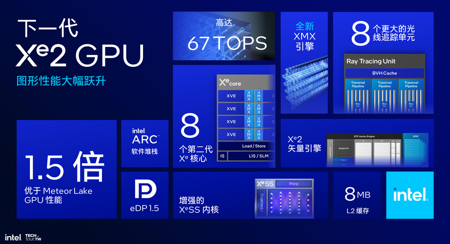 Lunar Lake架构处理器的核芯显卡也进行了全新设计,是全新的显卡架构,图形性能至高可达Meteor Lake核芯显卡的1.5倍。