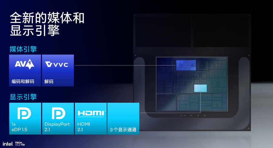 Xe 2 GPU此次还拥有全新的媒体和显示引擎。其中在媒体引擎部分,不仅支持AV1编解码,而且还支持VVC解码。
