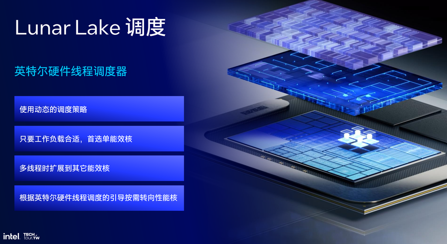 此次,英特尔还为Lunar Lake架构处理器设计了全新的硬件线程调度器,以便充分发挥新CPU架构的性能优势,并且显著控制功耗。