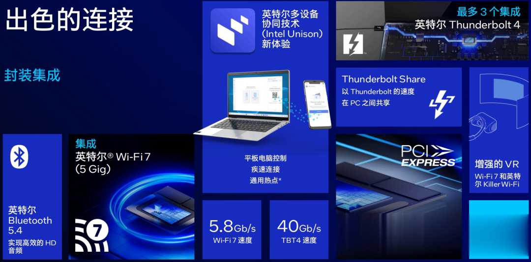 内置安全引擎保护系统,升级后的连接套件整合了Wi-Fi 7.0、蓝牙5.4、PCIe第5代和第4代端口,以及Thunderbolt™ 4端口。