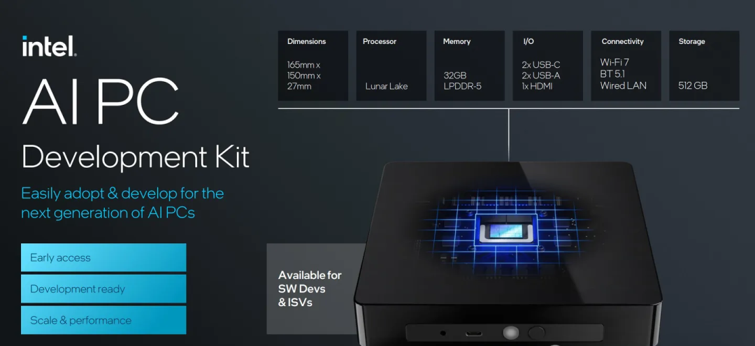 据了解,Lunar Lake将在今年第三季度发货,英特尔还将销售类似Mac Mini的AI PC开发套件: