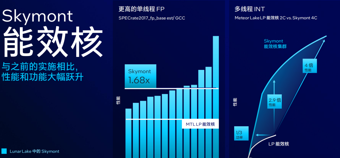 而且,E核运行速度与LP-E核心一样,功耗却只有LP-E内核的三分之一,在性能上可以提升2倍或4倍(单线程、多线程)。
