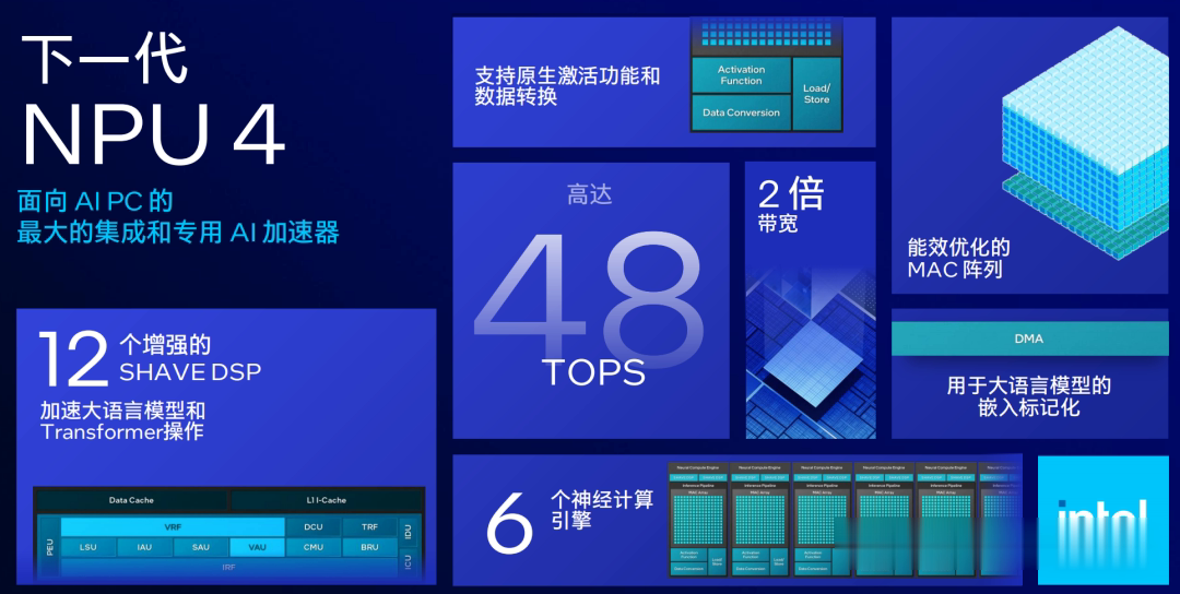 而Lunar Lake将芯片上的NPU硬件数量增加了2倍,内存带宽增加1倍,并将时钟速度从1.4GHz提高到1.95GHz,提供高达48 TOPS和约2-4倍的整体性能。