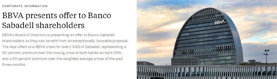 西班牙对外银行(BBVA)向规模较小的竞争对手Banco de Sabadell银行发起了价值122.3亿欧元的敌意收购要约,尽管Sabadell银行的董事会已在早些时候以相同条件拒绝了这一提议。BBVA的愿景是打造一家在全球范围内拥有超过1亿客户、资产规模超过1万亿欧元的银行,这将使其在西班牙银行业中仅次于桑坦德银行。合并后的银行还将超越Caixabank,成为西班牙最大的国内银行。BBVA和Sabadell曾在2020年11月进行过合并谈判,但由于在包括价格在内的条款上未能达成一致,谈判最终取消。