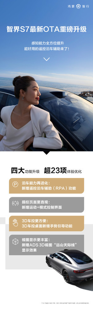 6月6日,CNMO从智界汽车官方了解到,智界S7再迎OTA重磅升级,新增遥控泊车功能更便捷,运动+模式控制界面更直观,3D车控更方便,视图显示更丰富。
