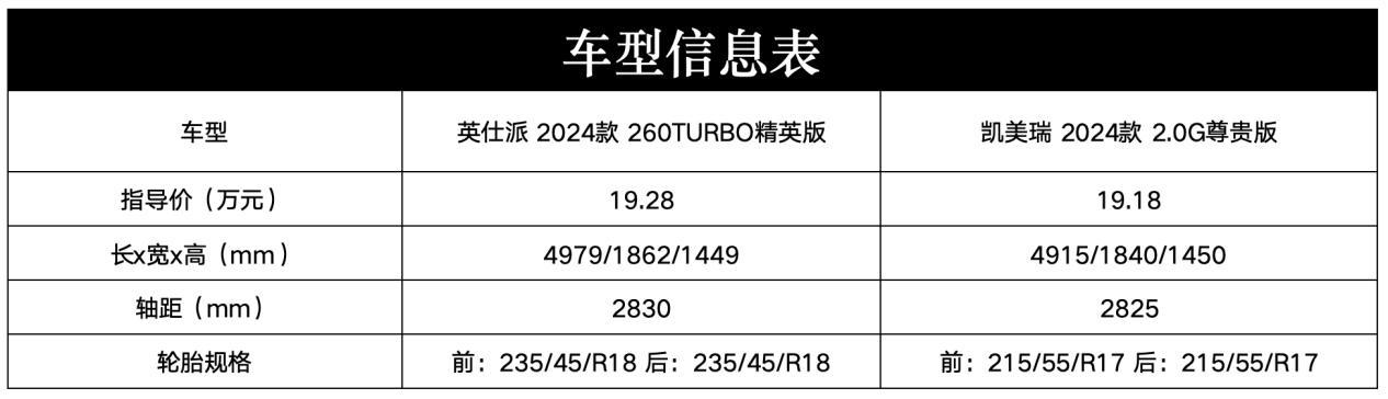 今天选择的两款车均为燃油版本,本田英仕派官方指导价格比丰田凯美瑞高一千元,价格基本相同,同为B级车,英仕派在外观尺寸以及轴距上都更有优势,另外轮胎规格上也能够看出英仕派轮胎宽度以及轮毂尺寸都要大出不少。