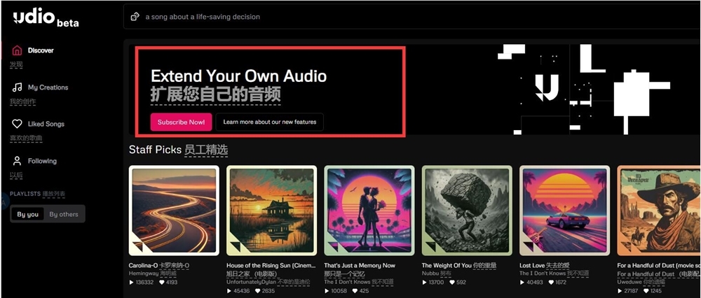 标签和歌曲搜索:Udio改进了标签和歌曲搜索功能,包括实现了标签自动完成,这使得用户能够更快地找到他们需要的内容。