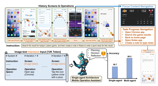 与之前的Mobile-Agent相比,Mobile-Agent-v2引入了创新的多代理协作架构。这种架构允许多个AI代理协同工作,以实现更加高效的任务规划和执行。这种协作机制不仅提升了任务处理的灵活性,还显著提高了任务完成的效率。