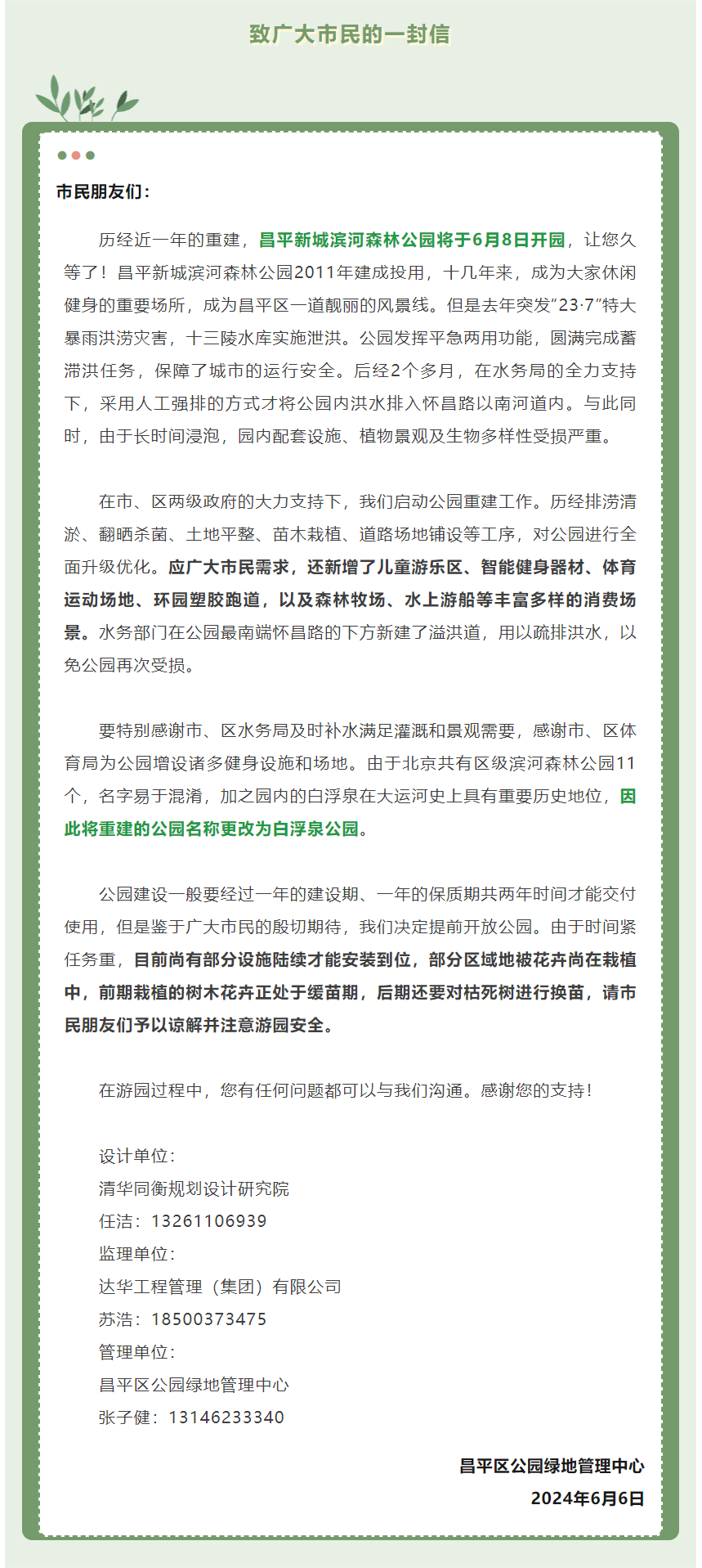 要特别感谢市、区水务局及时补水满足灌溉和景观需要,感谢市、区体育局为公园增设诸多健身设施和场地。由于北京共有区级滨河森林公园11个,名字易于混淆,加之园内的白浮泉在大运河史上具有重要历史地位,因此将重建的公园名称更改为白浮泉公园。