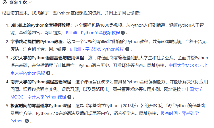 第三步,根据python学习规划,需要@AI搜索去找资源。@AI搜索会根据每一个小任务去搜索课程,并附带课程链接。只需要点击链接,就能按部就班完成学习计划。
