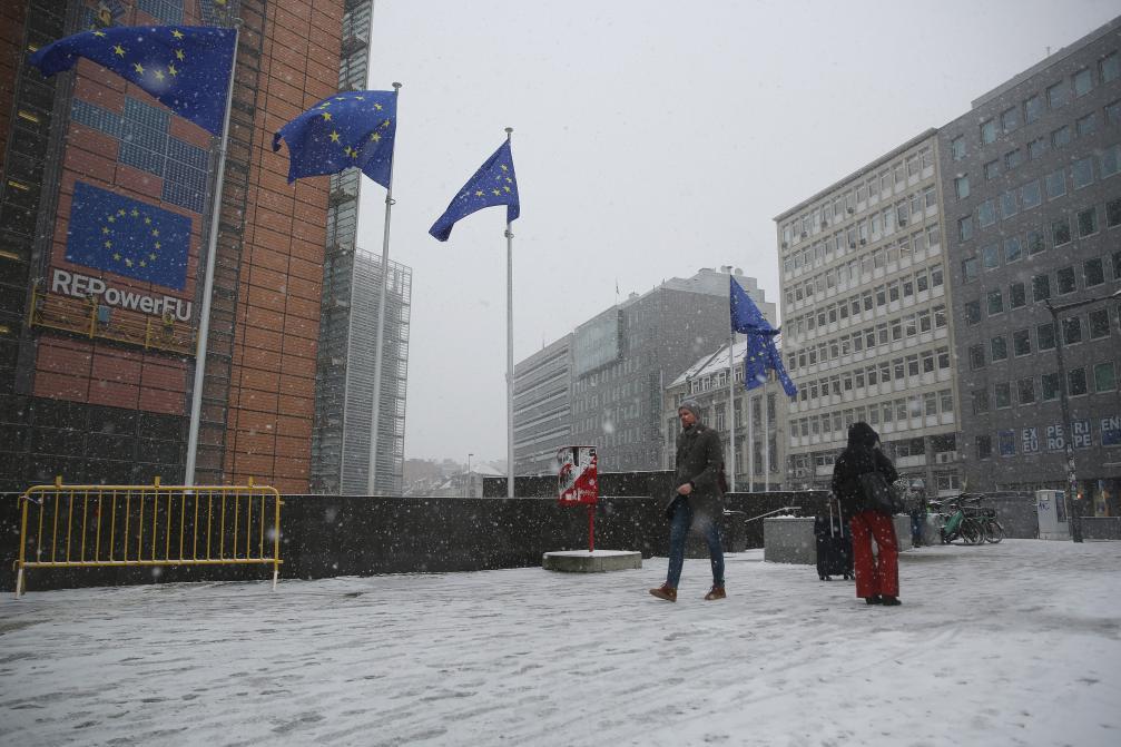 1月17日,在位于比利时布鲁塞尔的欧盟总部附近,人们冒雪出行。新华社记者赵丁喆摄