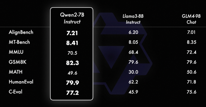 而在小模型方面,Qwen2系列模型基本能够超越同等规模的最优开源模型甚至更大规模的模型。相比近期推出的最好的模型,Qwen2-7B-Instruct依然能在多个评测上取得显著的优势,尤其是代码及中文理解上。