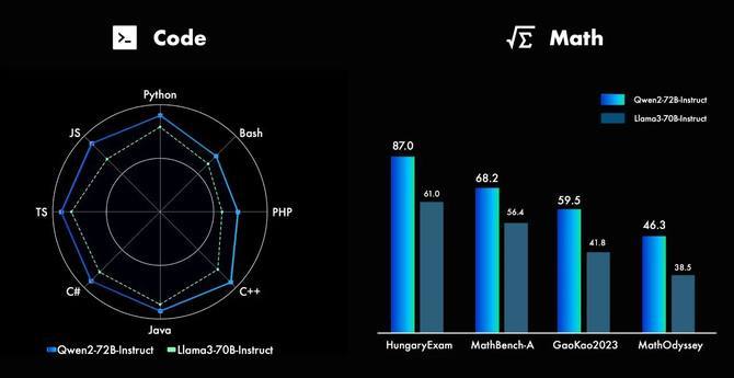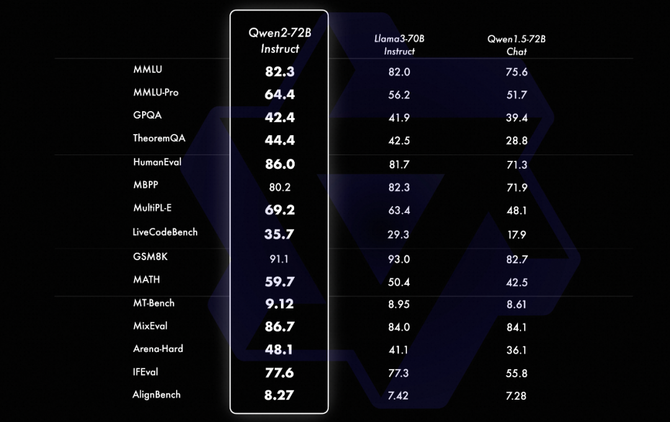 在过去一段时间里,Qwen系列模型从Qwen1.5升级到Qwen2,Qwen2分5个尺寸,包括Qwen2-0.5B、Qwen2-1.5B、Qwen2-7B、Qwen2-57B-A14B以及Qwen2-72B。此次开源的Qwen2是阿里云最强模型,目前已经在Hugging Face和ModelScope上同步开源信息,用户可下载使用。Qwen2-72B上下文长度达到128K tokens,在自然语言理解、知识、代码、数学及多语言能力上均有出色表现。在基准测试中,可以匹敌Llama-3-70B-Instruct。
