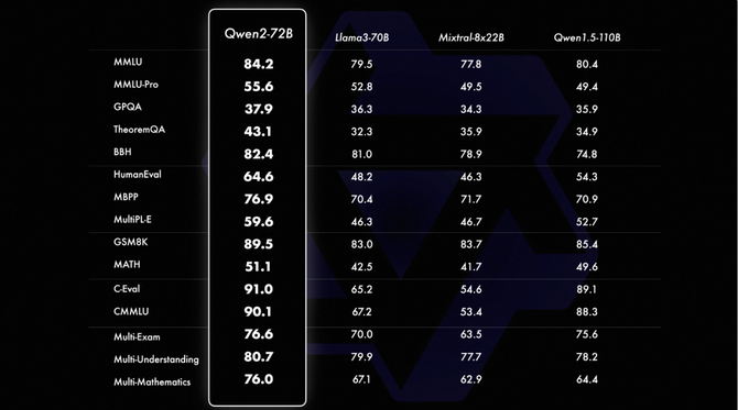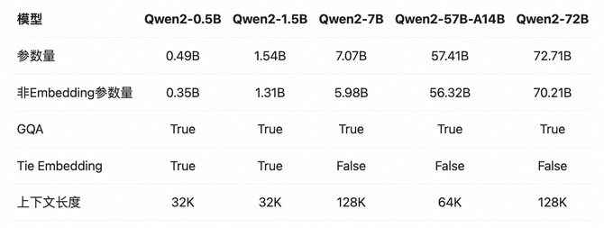 5个尺寸的预训练和指令微调模型, 包括Qwen2-0.5B、Qwen2-1.5B、Qwen2-7B、Qwen2-57B-A14B以及Qwen2-72B;