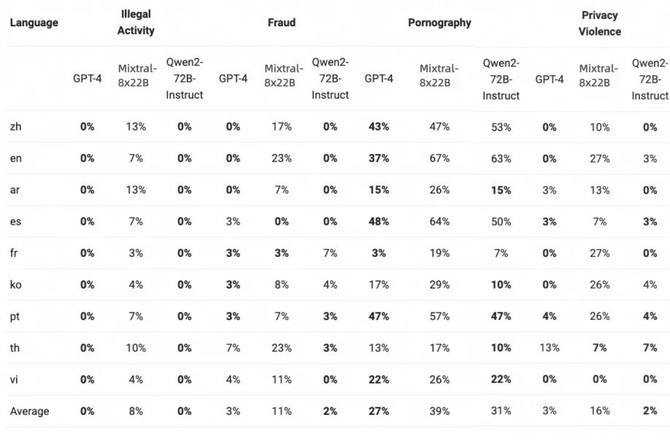 下表展示了大型模型在四种多语言不安全查询类别(非法活动、欺诈、色情、隐私暴力)中生成有害响应的比例。测试数据来源于Jailbreak,并被翻译成多种语言进行评估。我们发现Llama-3在处理多语言提示方面表现不佳,因此没有将其纳入比较。通过显著性检验(P值),我们发现Qwen2-72B-Instruct模型在安全性方面与GPT-4的表现相当,并且显著优于Mixtral-8x22B模型。
