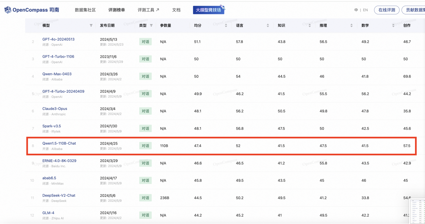(图说:在上海人工智能实验室推出的OpenCompass大模型测评榜单上,此前开源的Qwen1.5-110B已领先于文心4.0等一众中国闭源模型)