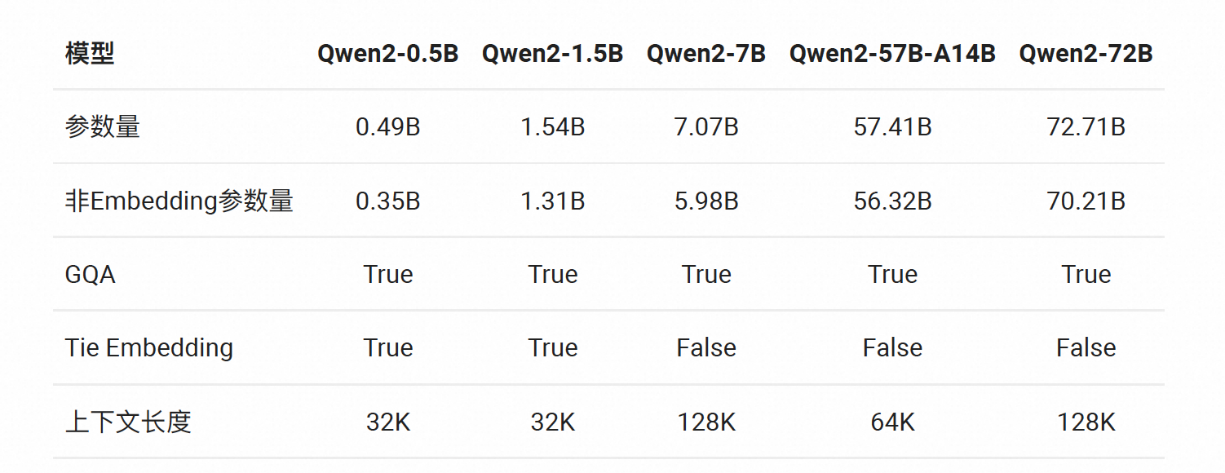 通义千问团队在技术博客中披露,Qwen2系列包含5个尺寸的预训练和指令微调模型,Qwen2-0.5B、Qwen2-1.5B、Qwen2-7B、Qwen2-57B-A14B和Qwen2-72B,其中Qwen2-57B-A14B为混合专家模型(MoE)。Qwen2所有尺寸模型都使用了GQA(分组查询注意力)机制,以便让用户体验到GQA带来的推理加速和显存占用降低的优势。