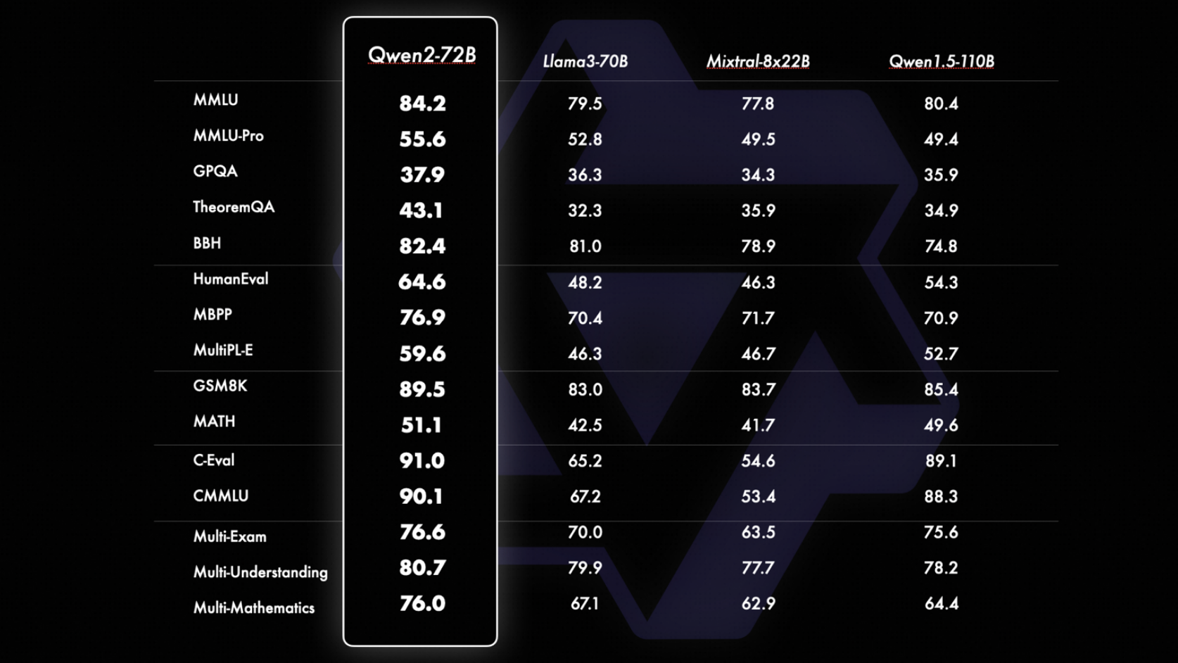 (图说:Qwen2-72B在十多个权威测评中获得冠军,超过美国的Llama3-70B模型)