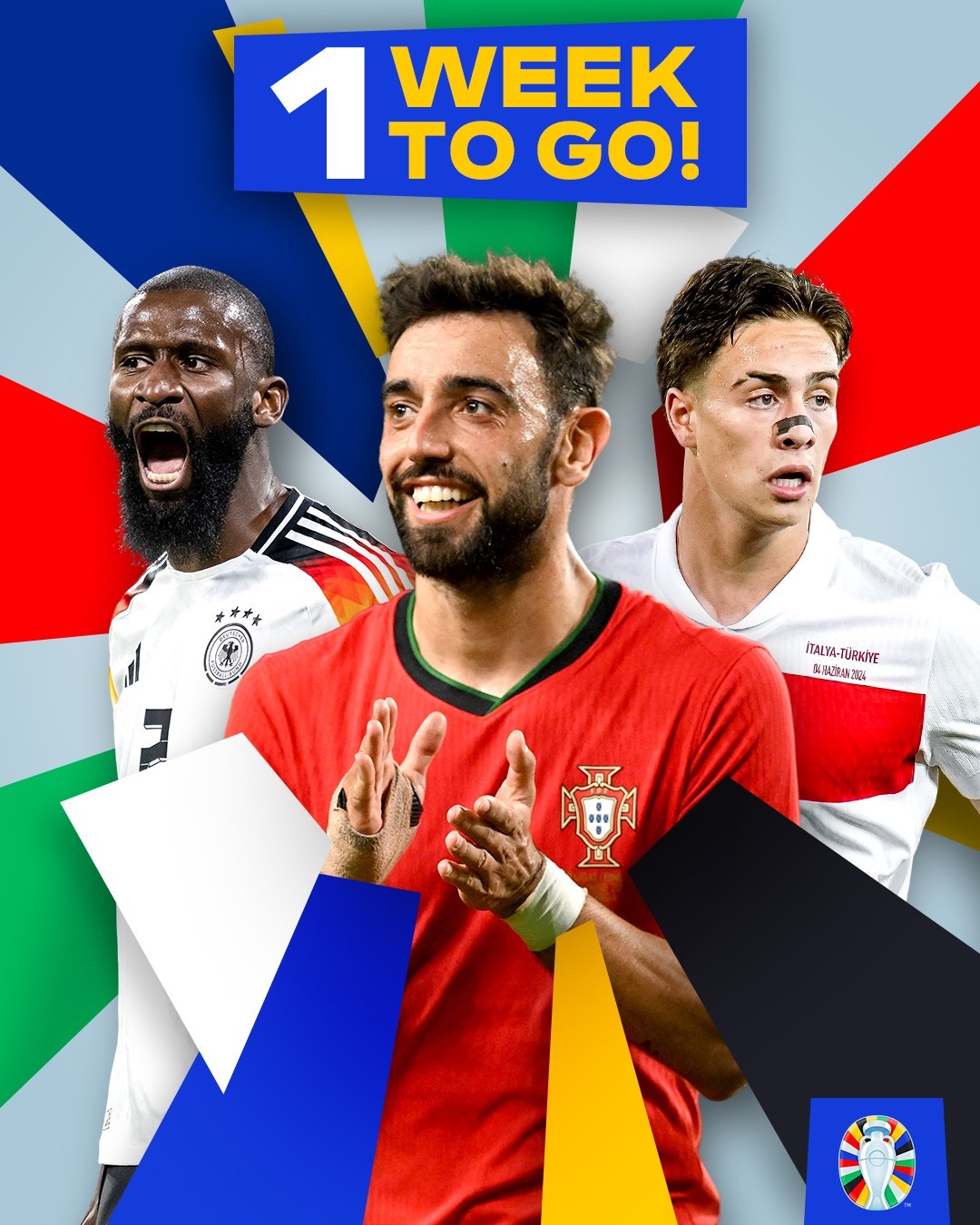 北京时间今天16:00,2024欧洲杯在官方社媒上发布了一张开赛倒计时一周的海报。