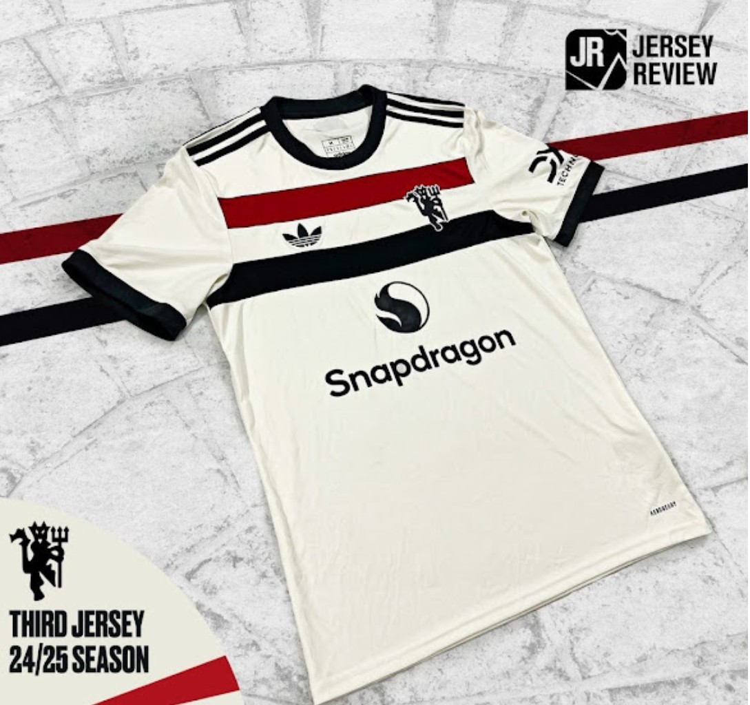 曼联24-25赛季的第三套球衣最突出的特点是胸前有一条由红色、米白色和黑色组成的三色条纹,背面是一面带有UNITED字母的三色旗。