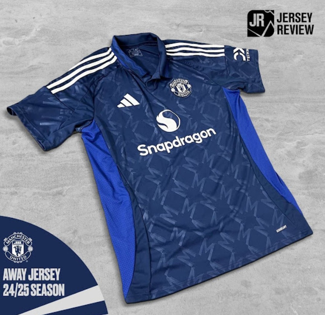 新推出的曼联24-25客场球衣以海军蓝为主色调(也被称为“夜靛蓝”),配以淡银色的logo和队徽标志。