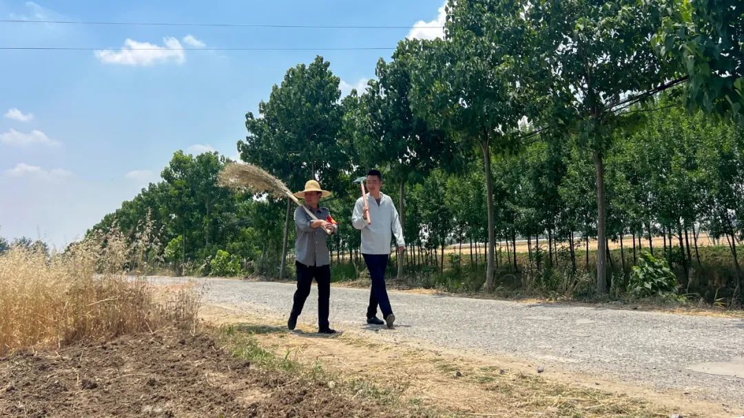 6月7日中午12点20分,在官山镇黄圩社区前姚组一处秸秆看守点,巡查员正沿着道路对周边农田进行巡查,并清理道路上散落的秸秆。